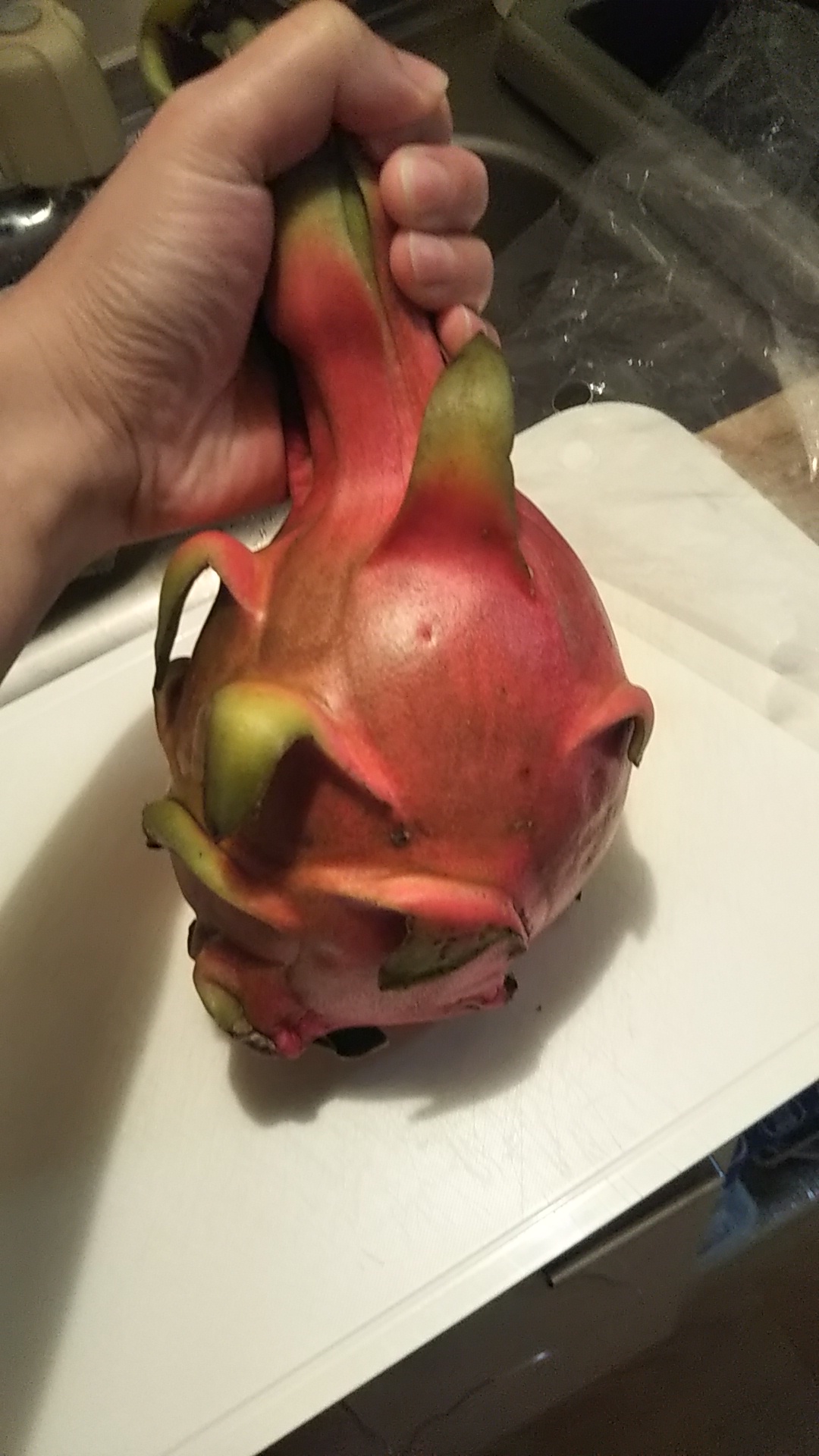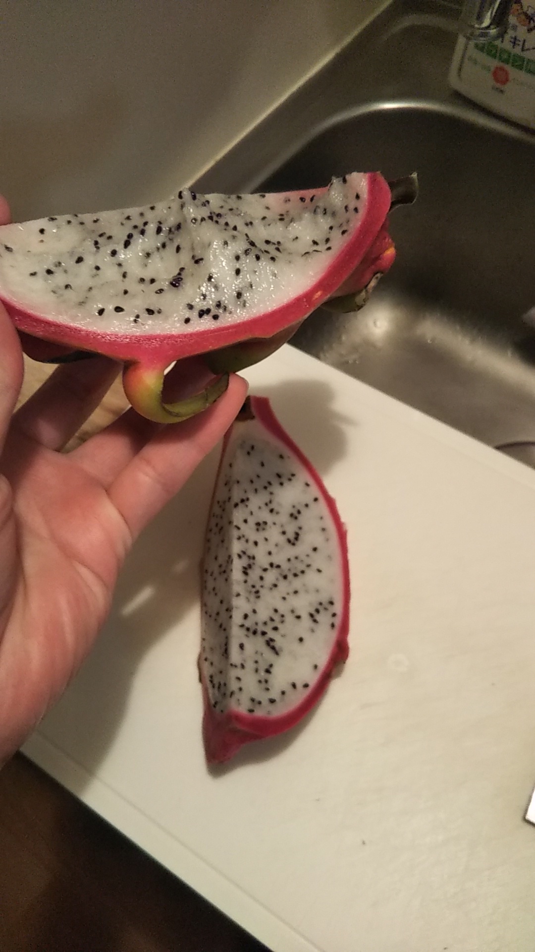 以前スーパーで見かけて、いつかこの丸まま買って切って食ってみてえ…!と思いつつ味的に食い切れるか心配で諦めてたブツ。そしたらその後ドラゴンフルーツジュースを飲む機会があり、これならいける!と納得し、そして数日前に割引シール貼られてるの見かけて、買うっきゃねえ!と。